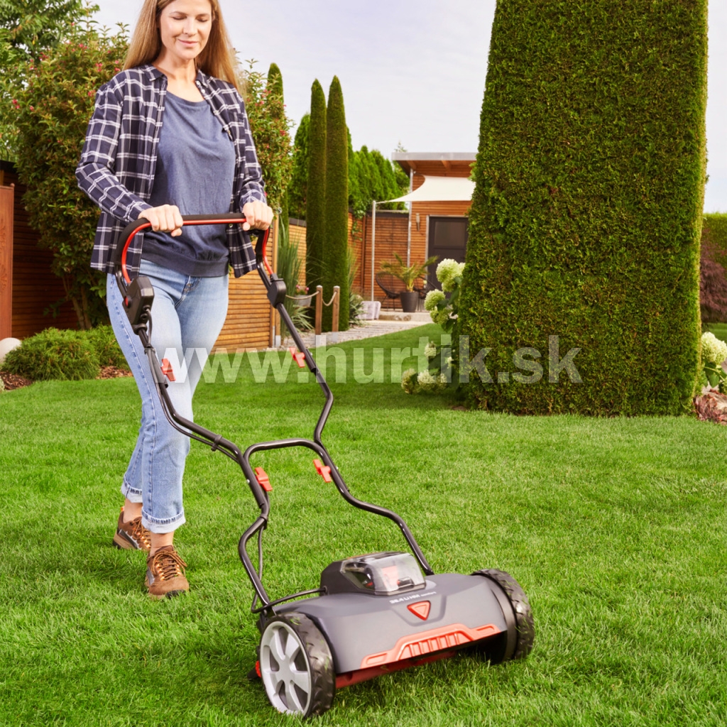 Tým, že sa kosiace vreteno s 5 oceľovými nožmi a spodný nôž navzájom nedotýkajú, získate presný a čistý strih a trávnik je perfektne udržiavaný - akoby strihaný nožnicami. Výšku kosenia je možné nastaviť v štyroch krokoch od 14 do 38 mm. Dobrá trakcia vďaka veľkým kolesám s priemerom 200 mm. So šírkou kosenia 38 cm, kvalitnými nožmi a voliteľným 50 l zberným košom na trávu (č. položky 113868) je kosenie trávnika naozaj zábavné.