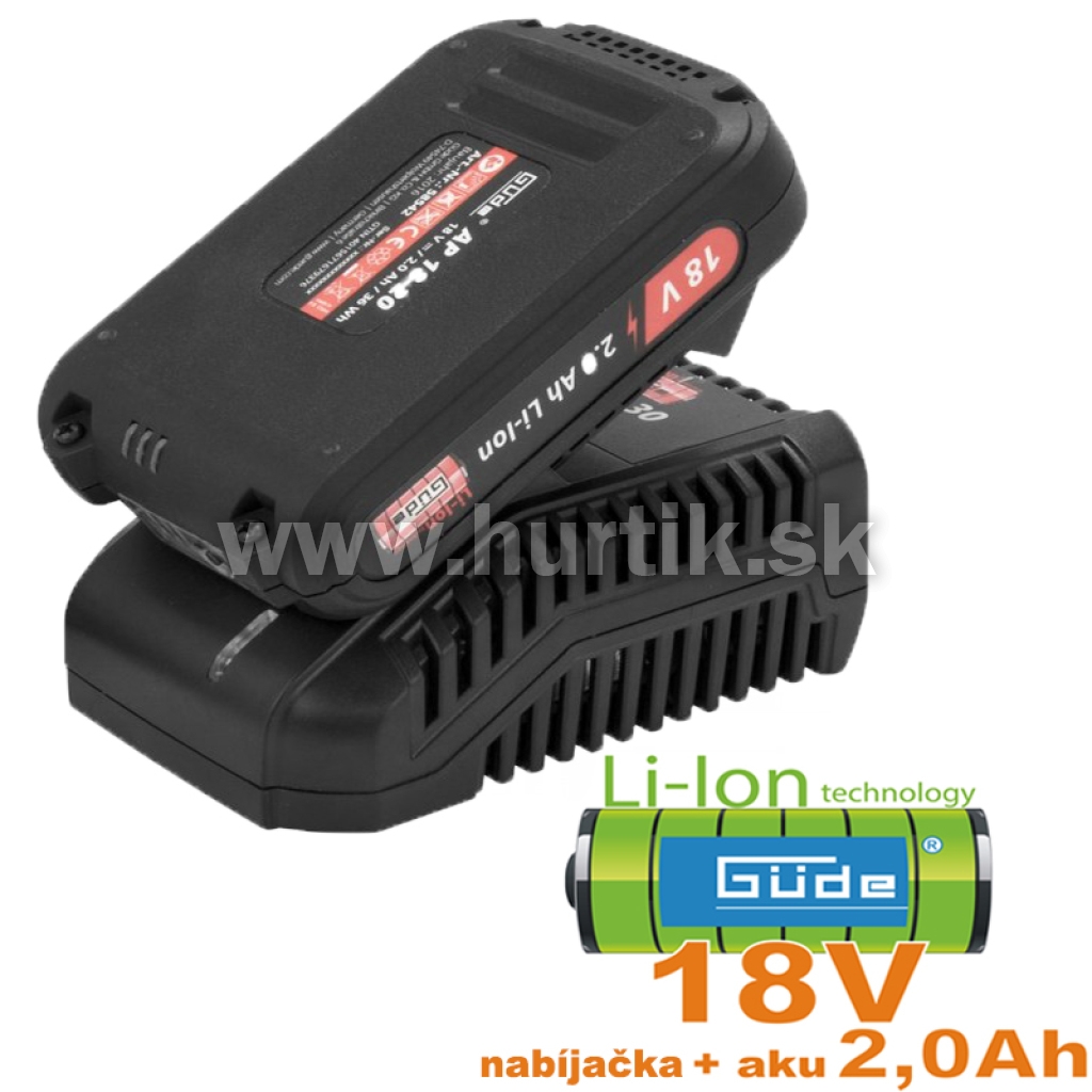 Spoľahlivý GUDE set ktorý obsahuje akumulátor a nabíjačku rady "Li-Ion" s kapacitou 2,0Ah a napätím 18V. Akumulátor je vybavený indikátorom stavu napätia s nabíjačkou ktorá je vybavená indikátorom stavu nabitia. Akumulátor je kompatibilný s GUDE výrobkami, čas nabíjania 2,0Ah akumulátora je cca 50min.