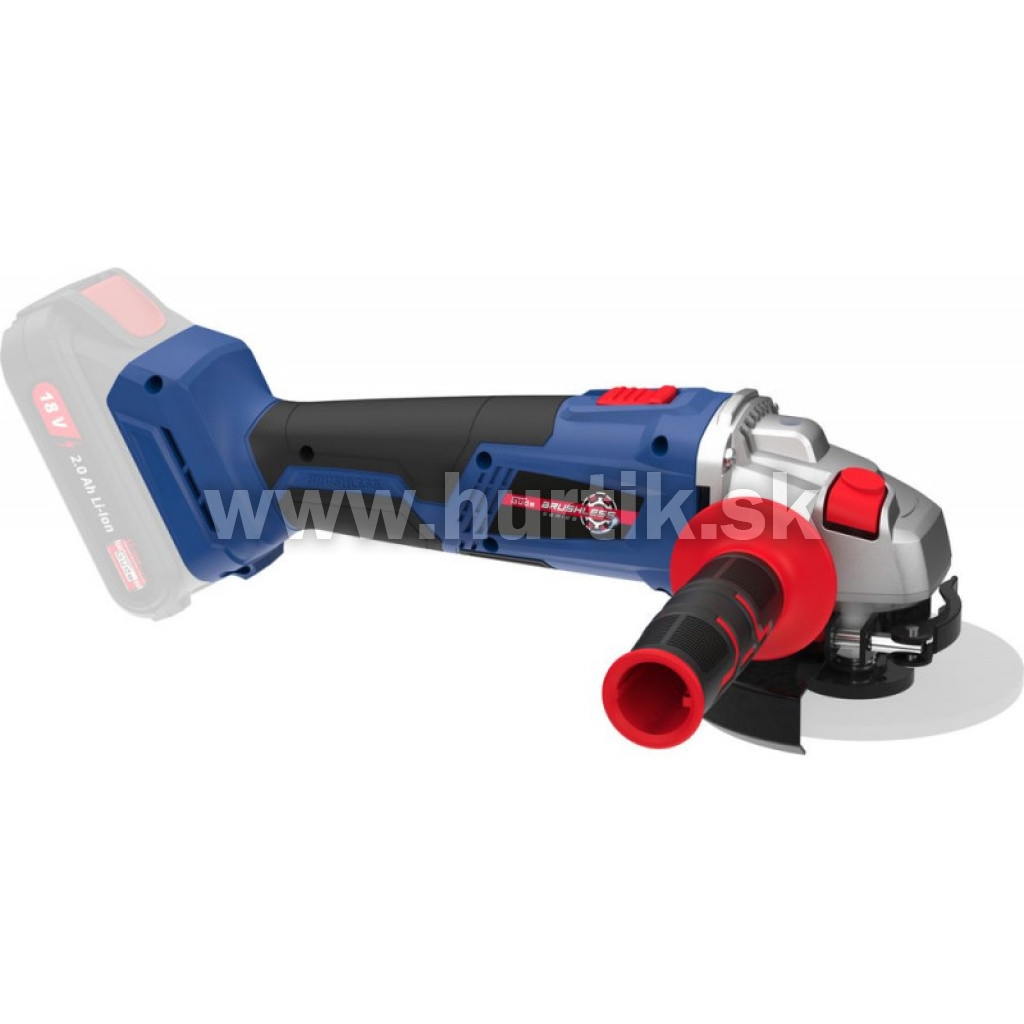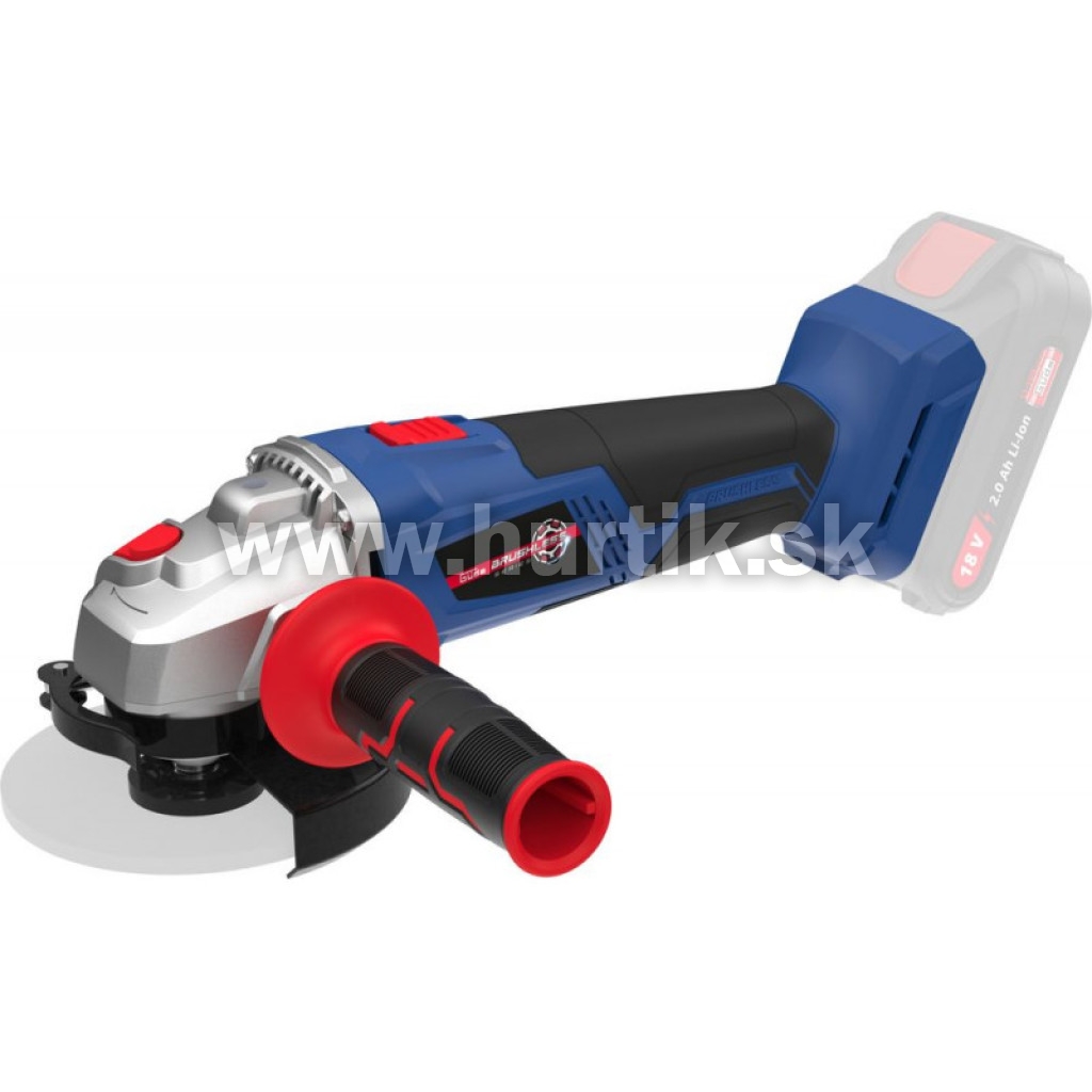 Akumulátorová uhlová brúska zo série akumulátorového náradia 18V E3. Bezuhlíkový motor pre lepší výkon a dlhšiu dobu chodu.
