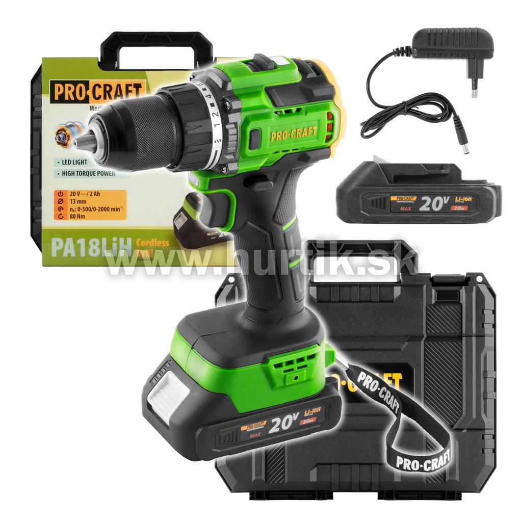 Balenie: aku skrutkovač Procraft PA18LiH-1B-C, akumulátor 20V 2Ah, klip na opasok, nabíjačka, kufor