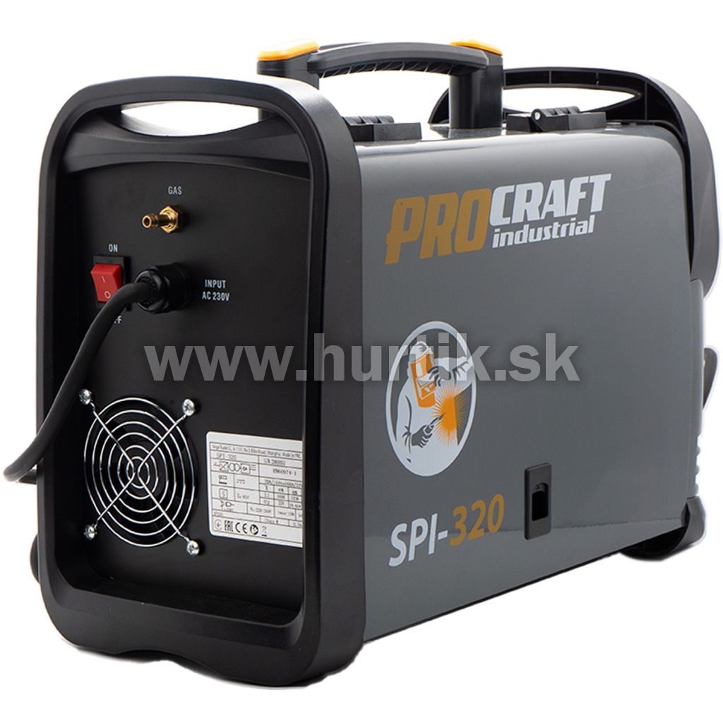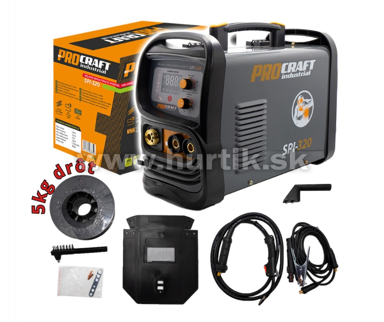 Zvárací invertor Procraft SPI-320 je určený na ručné zváranie metódou MIG a MAG. Výkonové tranzistory IGBT zaručujú dlhú bezporuchovú prevádzku. Regulácia zváracieho prúdu v rozsahu 20-160 A umožňuje nastaviť optimálne parametre pri práci s rôznymi kovmi. Možno použiť zvárací drôt s priemerom 0,6 až 1,0 mm. umožňuje zváranie inertnými alebo aktívnymi plynmi. Na LCD displeji sa zobrazuje aktuálny zvárací prúd. Súčasťou dodávky je zvárací drôt 0,8 mm (bubon s hmotnosťou 5 kg), MIG horák s káblom, zvárací štít, kábel s držiakom elektród, kábel s uzemňovacími kliešťami a drôtená kefa kombinovaná so struskovým kladivom. Kartónové balenie.