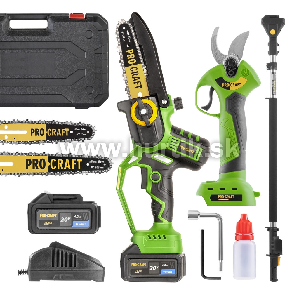 Sada Procraft PKA32Li + ES28Li + EP2.0 obsahuje aku reťazovú pílu a aku nožnice na vetvy s predlžovacím nadstavcom, vybavené bezuhlíkovým motorom a vysokým výkonom. Súčasťou balenia je batéria 20V 4Ah, nabíjačka, kufor, 2× vodiaca lišta a 2× reťaz.